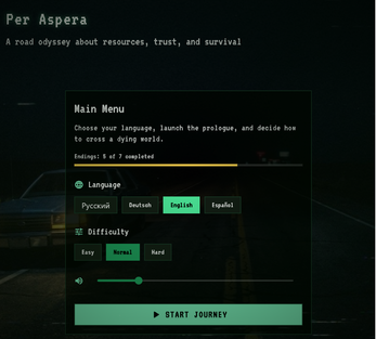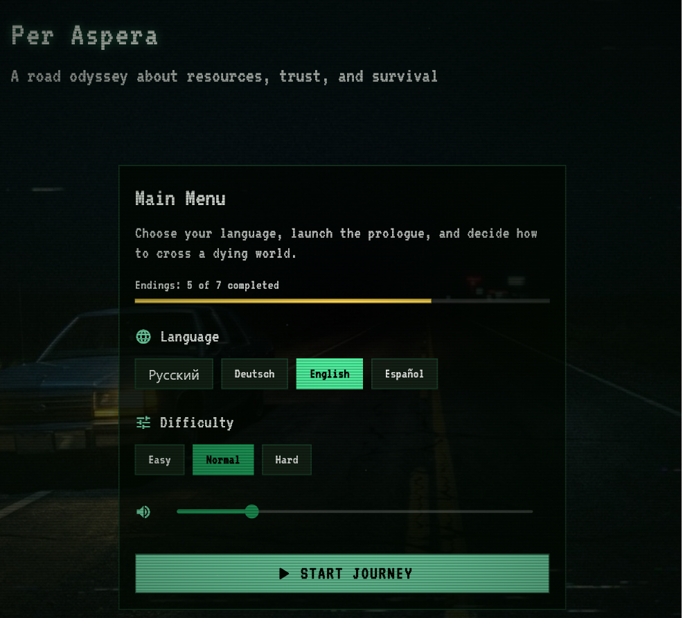 Per Aspera — это нарративная игра-ужас в духе VHS-кассеты, найденной в чужом мусоре. Ты едешь через умирающий мир, принимаешь решения, подбираешь странных попутчиков и медленно теряешь рассудок. Каждый выбор стоит ресурсов. Каждый попутчик — это сделка с чем-то, чему лучше не знать имени.