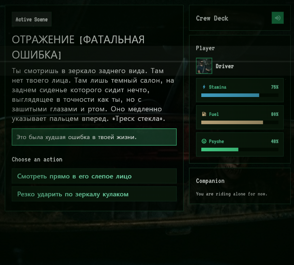 - Система попутчиков — каждый меняет твои ресурсы, психику и саму атмосферу поездки
